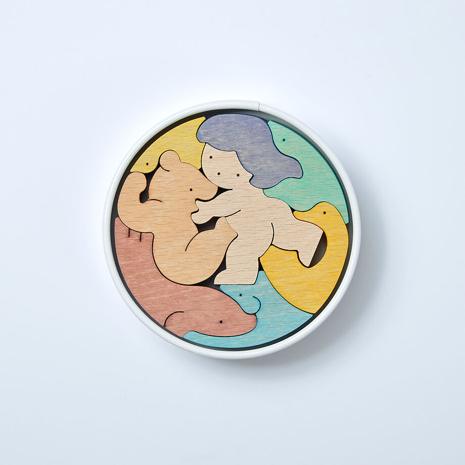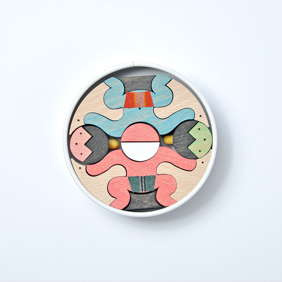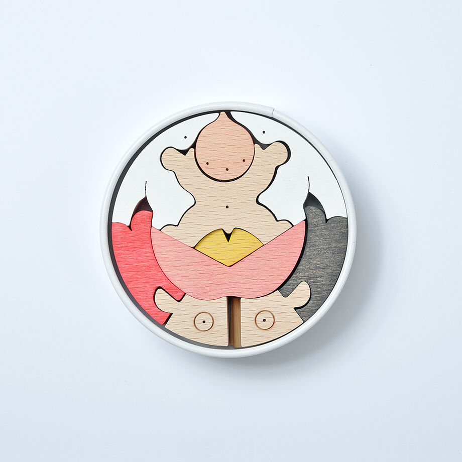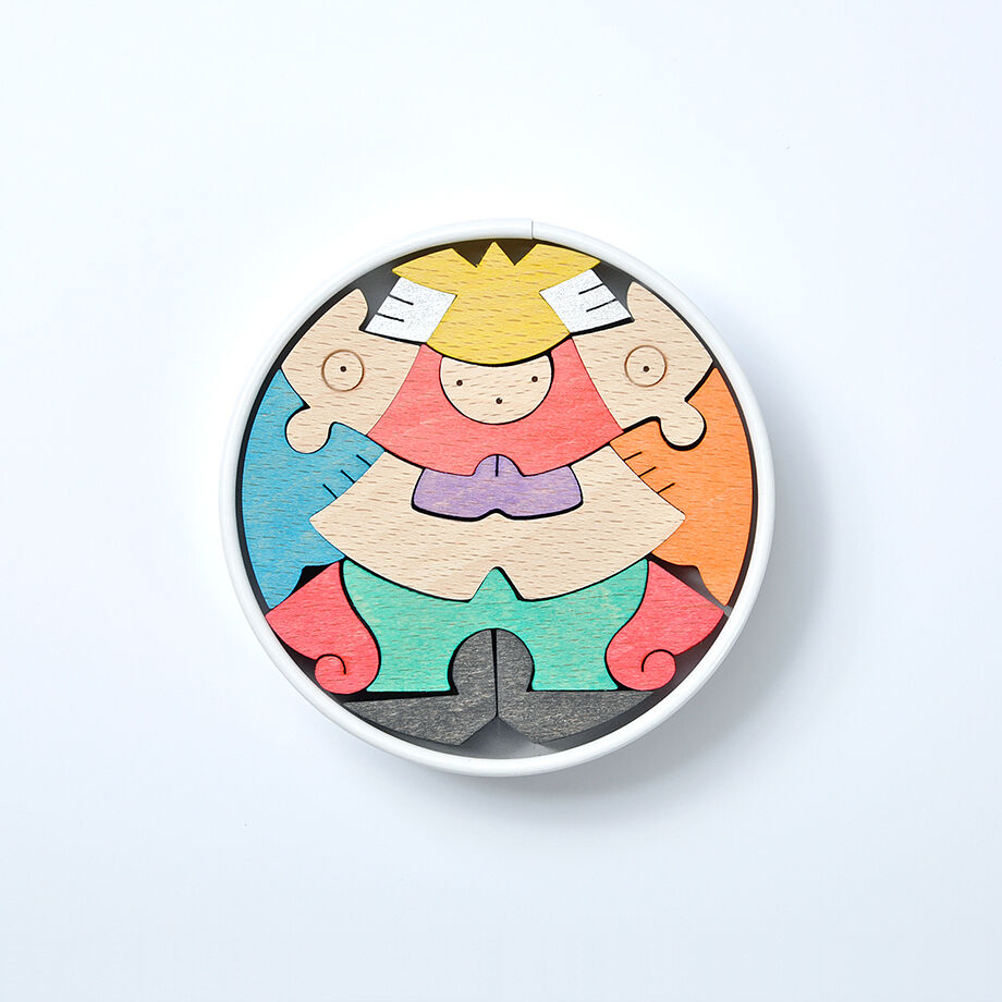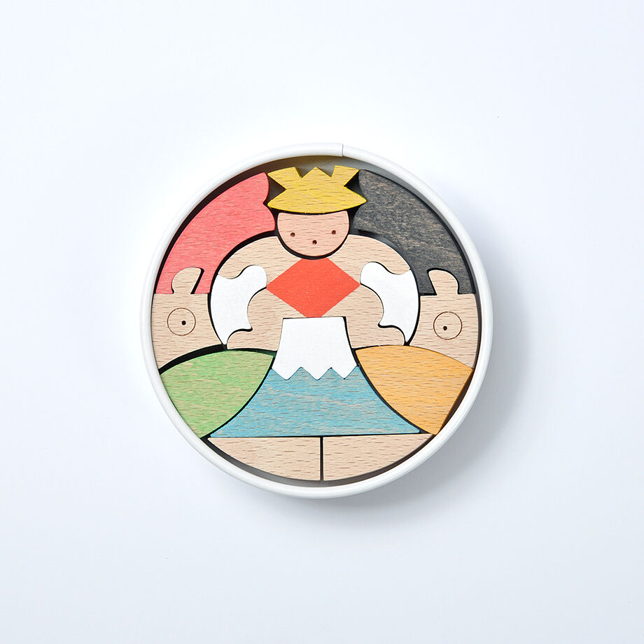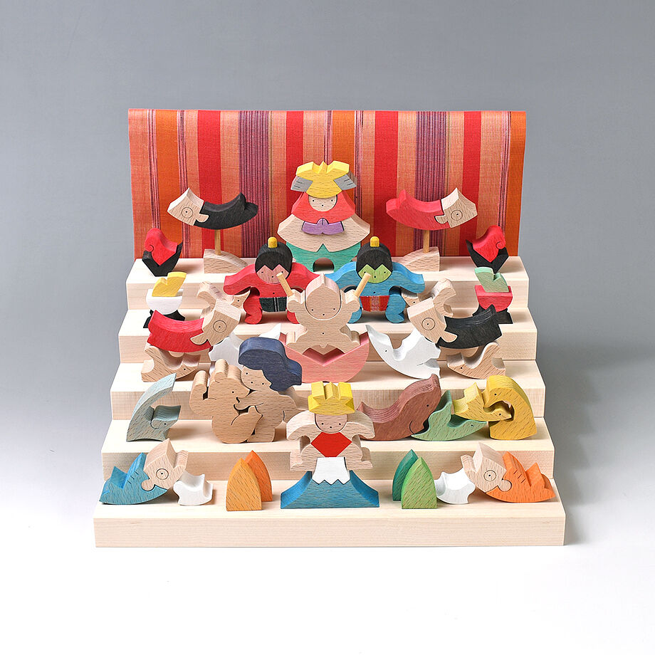 円形紙容器5箱に木片が収まる五段飾りの武者人形です。 一段目はかぶと童子と鯉とかがり火、二段目は赤鬼青鬼、三段目は桃太郎坊やと一対の鯉のぼり、鳥、銀杏の葉の扇、四段目は金太郎とクマと小動物、五段目は富士乗り兜童子と一対の鯉のぼりです。 里山で遊ぶ小動物たちと三童子をイメージして作ったので「里山円武者五段飾り」と名付けました。